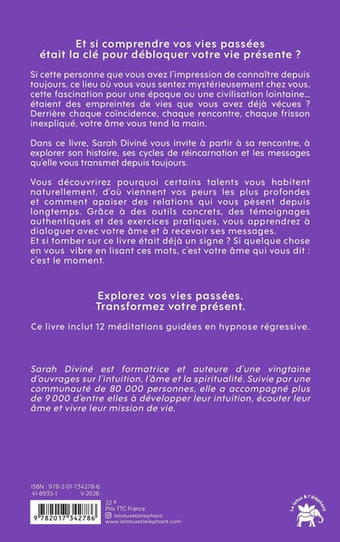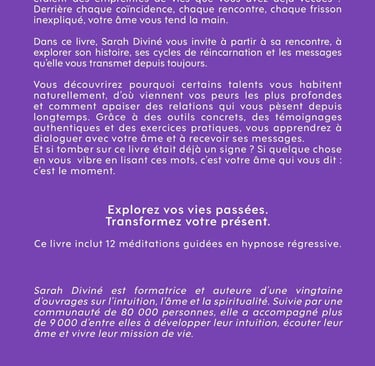Dans Messages de vos vies passées, je t'invite à explorer tes cycles de réincarnation pour comprendre qui tu es vraiment : tes talents, tes peurs, tes relations. Grâce à des témoignages authentiques, des exercices pratiques et 12 méditations guidées en hypnose régressive, tu apprendras à recevoir les messages que ton âme t'envoie depuis toujours.